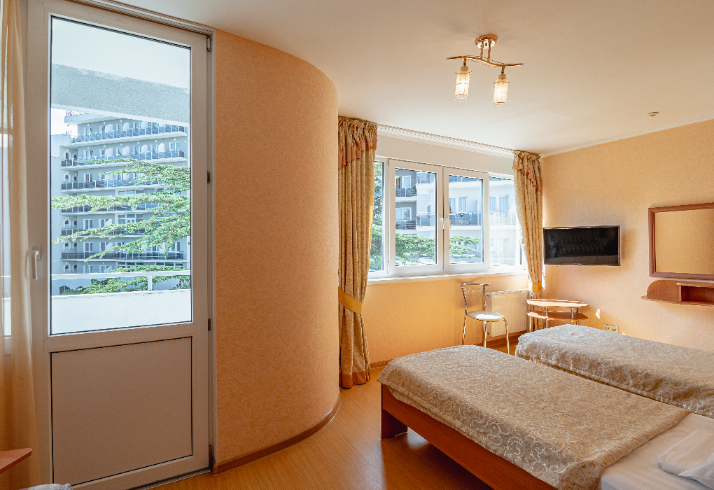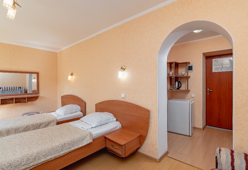 1 комната. 2 осн. места. В номере: телевизор; холодильник; кондиционер; душ; электрочайник; туалетные принадлежности; 1-спальные/ 2-спальная кровать. 1 доп. место: