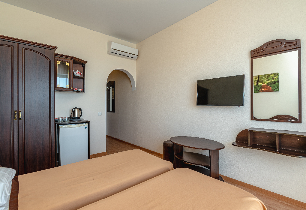 Площадь номера - 18 кв.м. 1 комната. 2 осн. места. В номере: телевизор; холодильник; кондиционер; душ; электрочайник; туалетные принадлежности; 1-спальные/ 2-спальная кровать.
