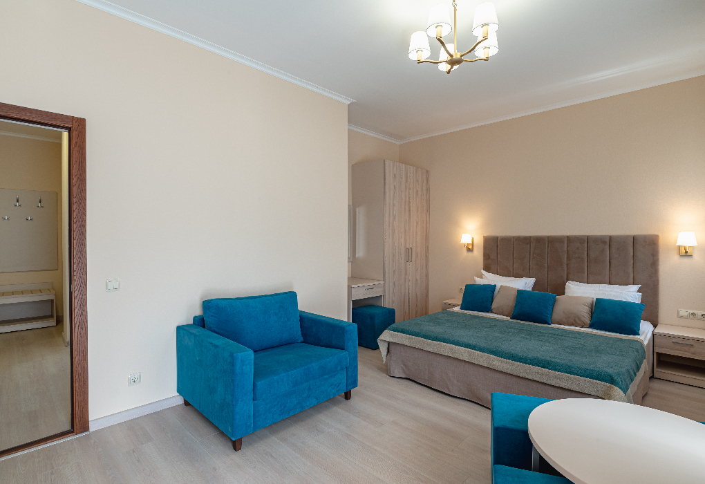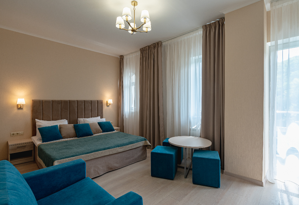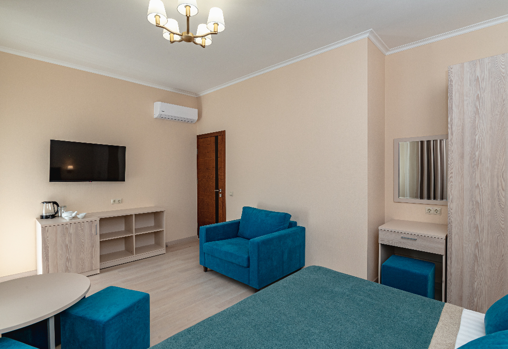 Площадь номера - 23 кв.м. 1 комната. 2 осн. места. вид на горы. В номере: телевизор; холодильник; кондиционер; душ; электрочайник; туалетные принадлежности; 2-спальная кровать; кресло. 1 доп. место: