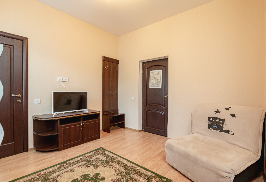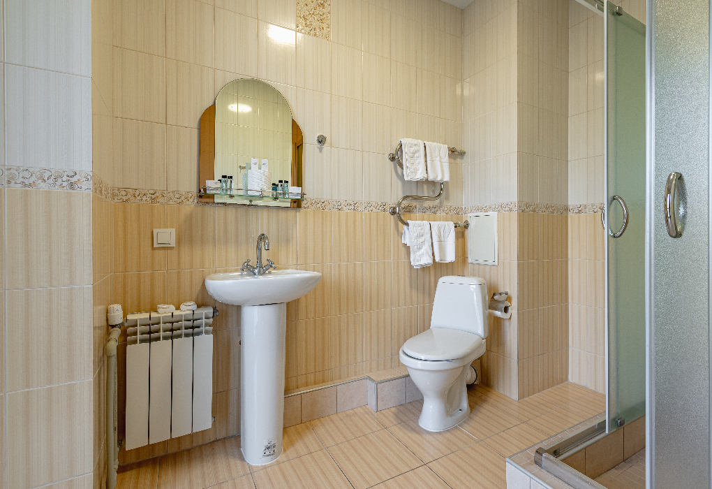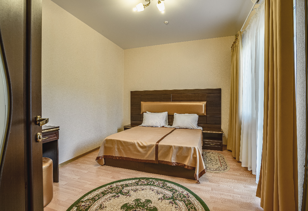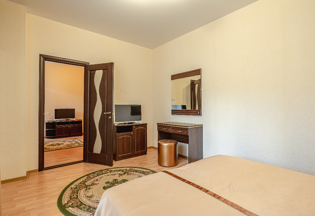 Площадь номера - 50 кв.м. 2 комнаты. 2 осн. места. В номере: телевизор; холодильник; кондиционер; душ/ванна; туалет; электрочайник; 2-спальная кровать; диван. 1 доп. место: